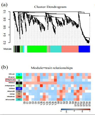 然后作者利用高分文章利器:WGCNA分析,進行數據深度挖掘和整理,推薦大家使用百邁客云平臺小工具WGCNA模塊,可以出來和作者同樣高大上的圖片。