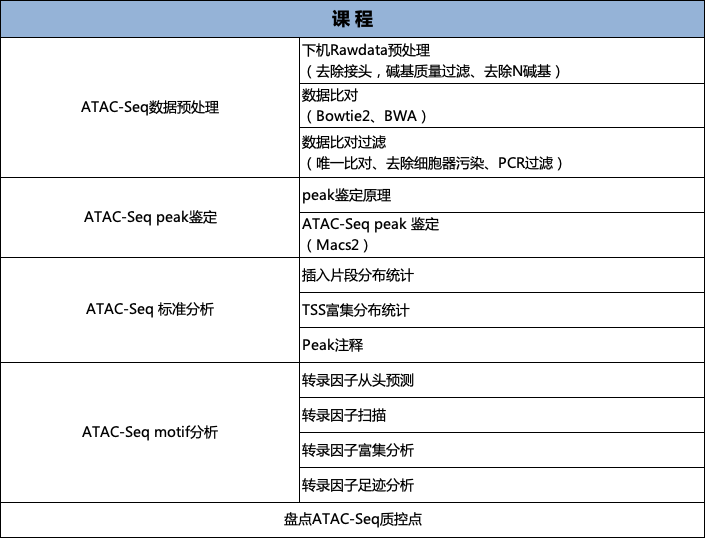 本課程主要從技術原理、實驗步驟、生物信息學分析、文獻分享四大內容向大家介紹ATAC-Seq技術。同時,本課程還涉及專門的生物信息學實操課程,帶領大家學習ATAC-Seq基本分析流程,其中包括數據質控、Peak Calling、Motif分析等。從而幫助大家將ATAC-Seq運用在自己的課題當中。